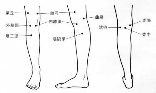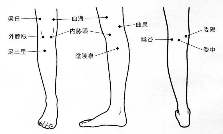 今回の症例で使用したツボは、内膝眼、外膝眼、陰陵泉、足三里、血海、曲泉、陰谷、梁丘、委中、委陽、内側裂隙に沿っての施灸、慢性の疼痛緩和を目的としての腕の曲池、大椎に20分間の置鍼をしました。